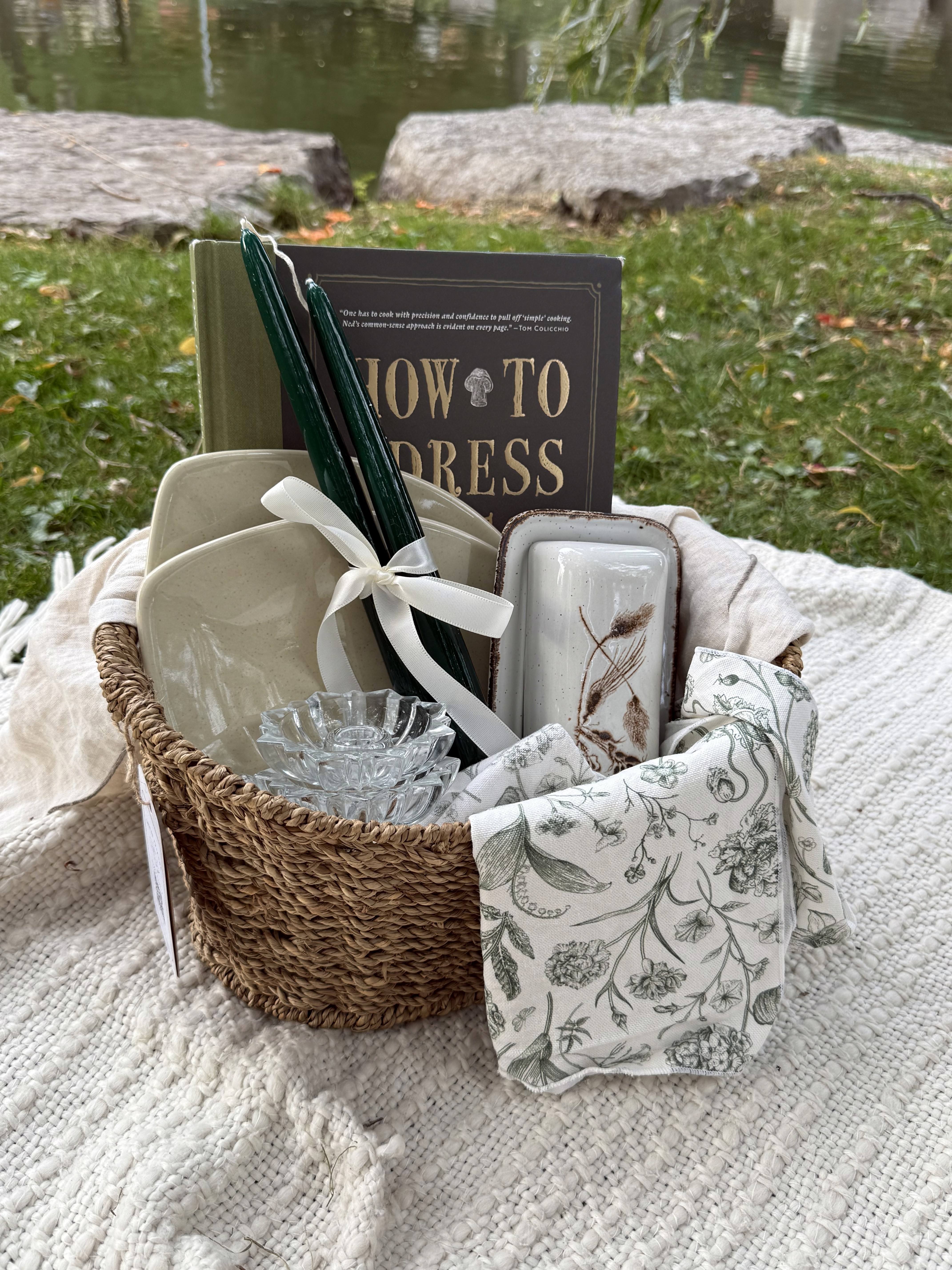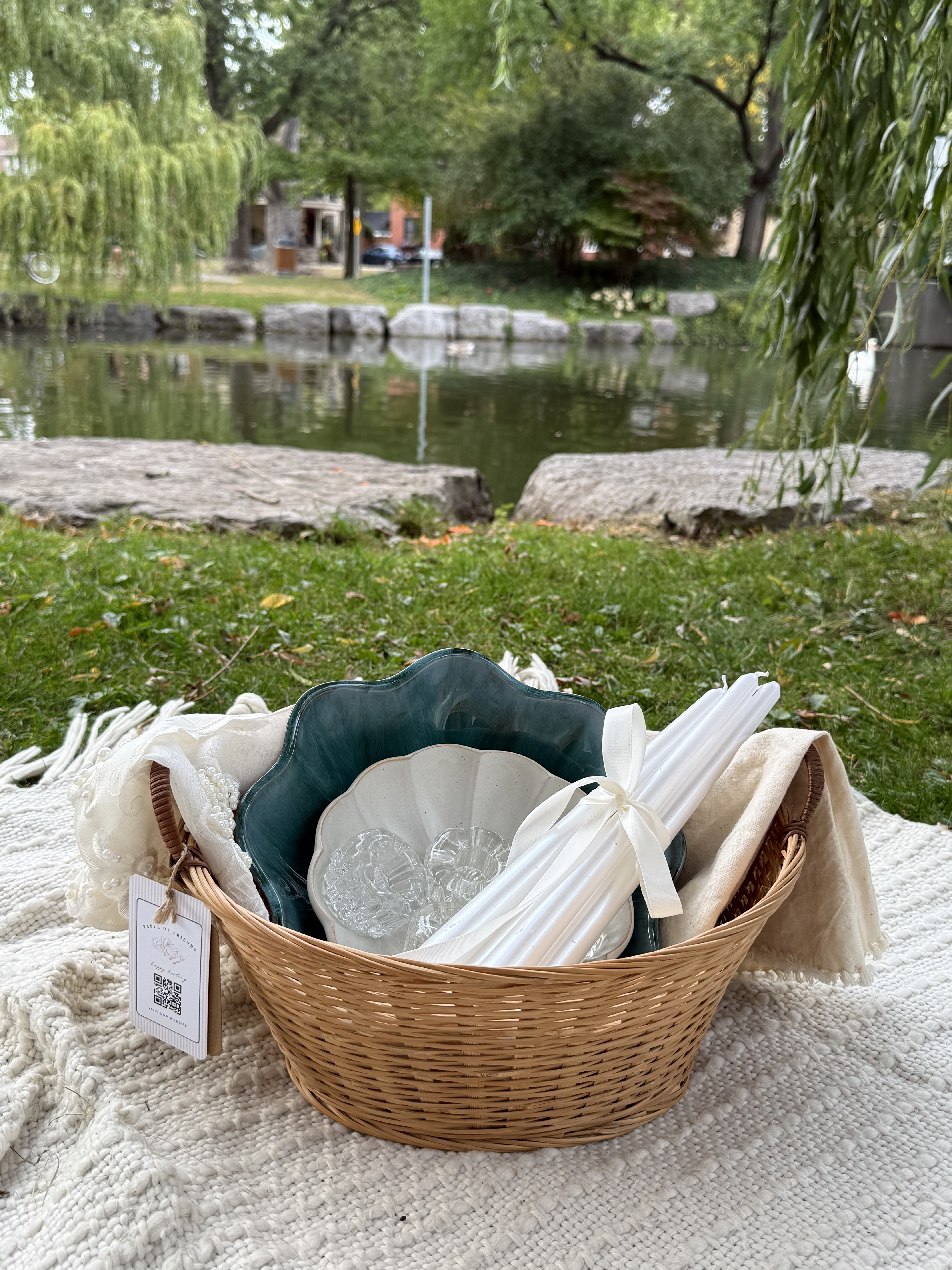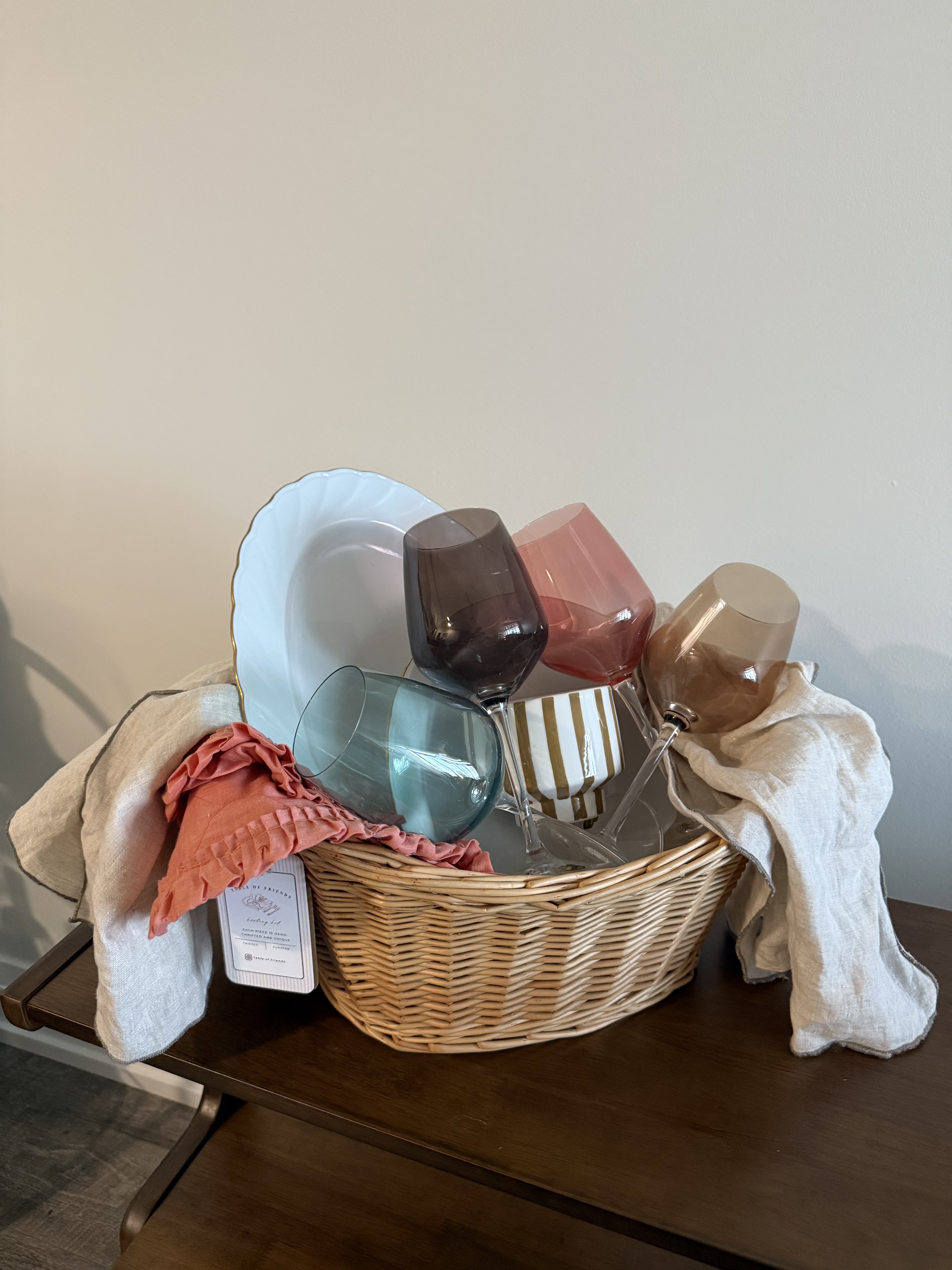 Each kit is thoughtfully curated with timeless, thrifted pieces, all bundled together in a basket ready for your next dinner party. No two baskets are ever the same; each one feels unique and personal, just like the gatherings you’ll create.